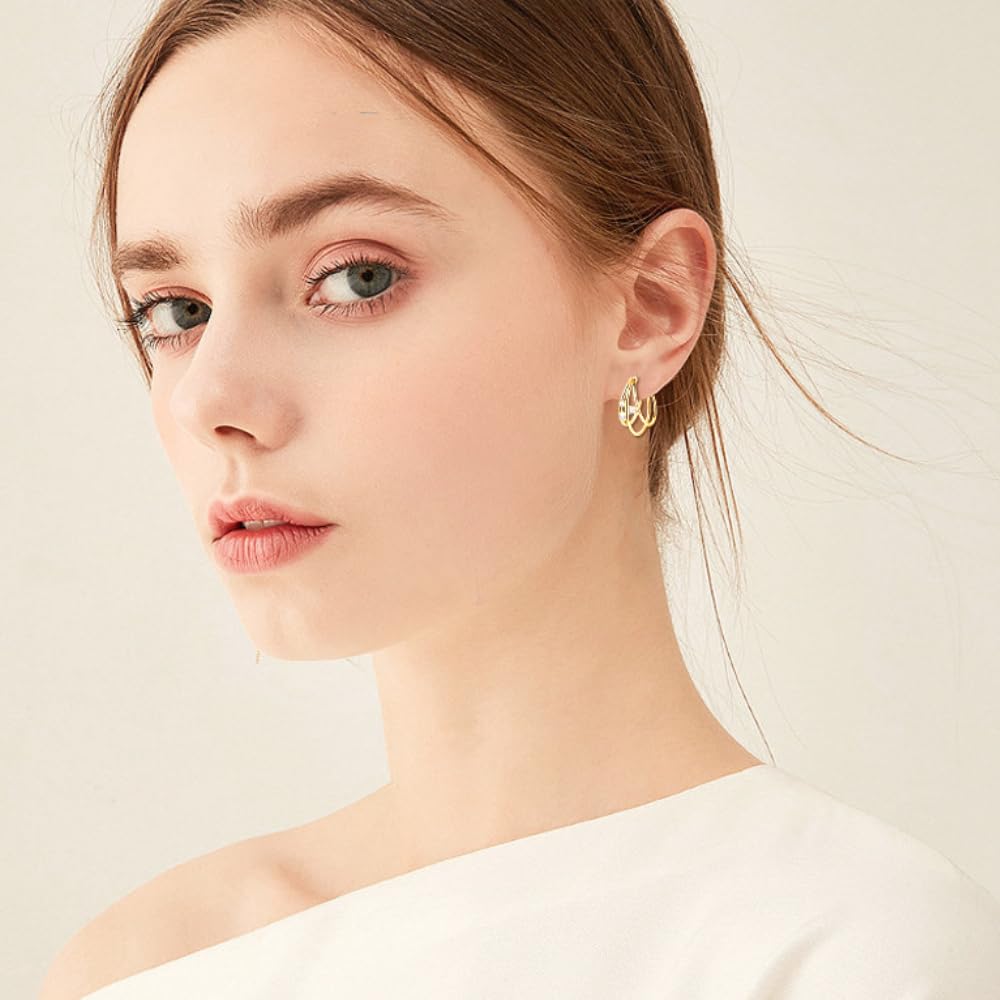 14K Solid Gold over S925 Silver 0.08 Carat Diamond Earrings, Versatile Triple-Layered Earrings Hoops with VVS1 Clarity,Stylish Gift (Yellow Gold)
