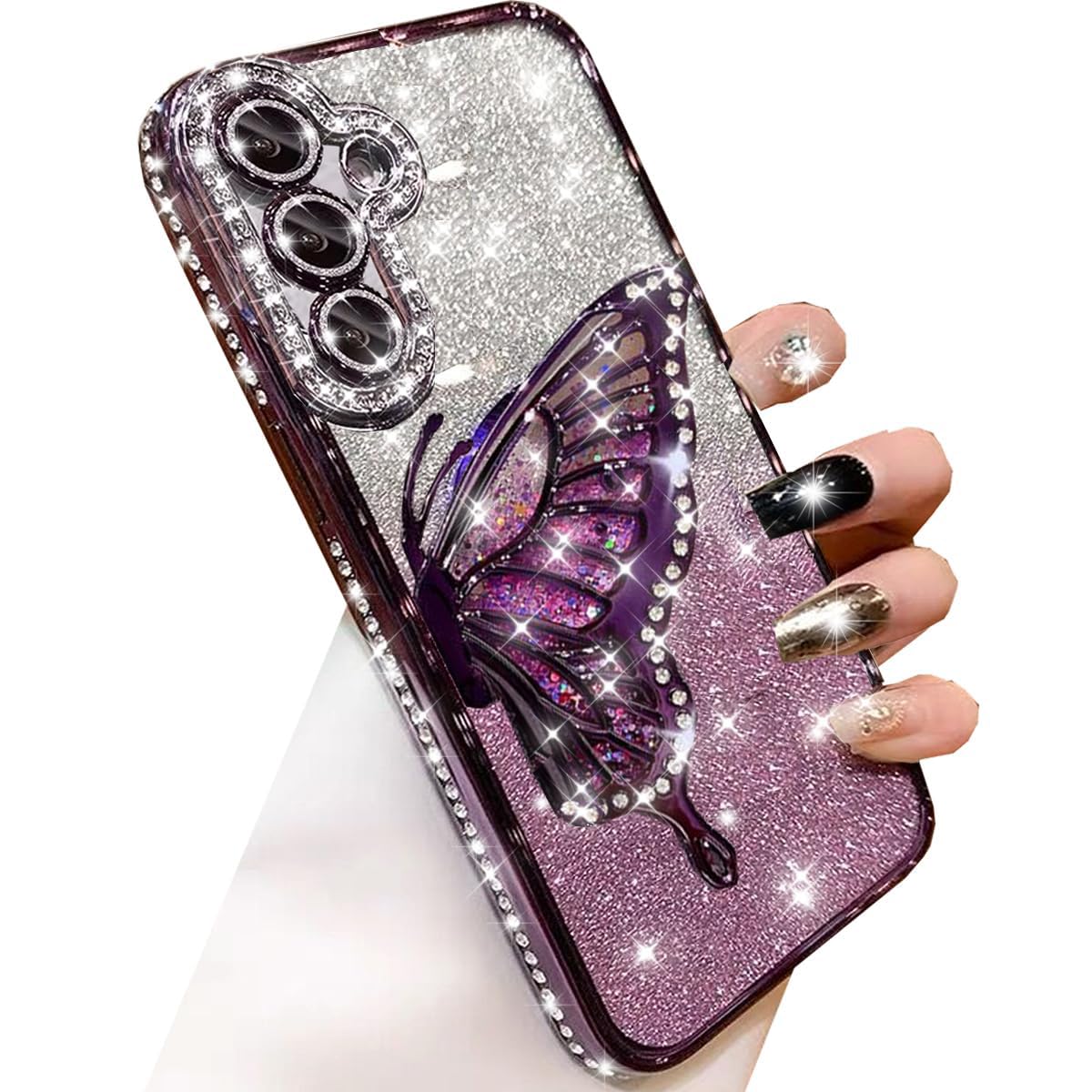 Changjia for Samsung Galaxy S25 Glitter 3D Butterfly Case,Cute Luxury Bling Sparkly Diamond Rhinestone Liquid Flowing Case with Camera Lens Protector TPU Bumper Women Girls Cover for Galaxy S25,Purple
