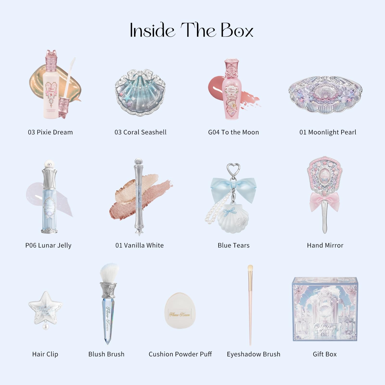 Flower Knows Shell’s Jewel 13-Piece Makeup Gift Box Set,Lip Gloss×2+Blush×1+ Eyeshadow Palette×1+Highlighter×3+Hand Mirror×1+Hair Clip×1+Mini Powder Puff×1+Blush Brush×1+Eyeshadow Brush×1+Gift Box×1