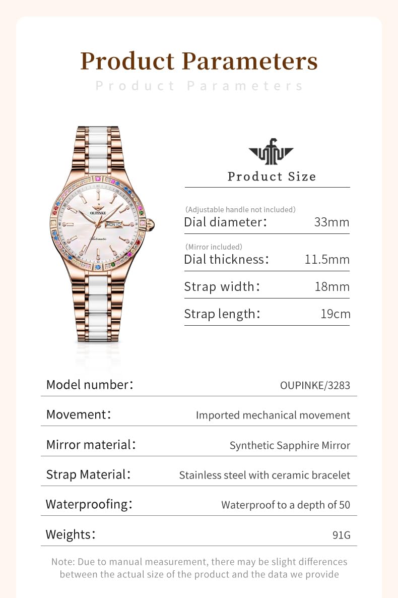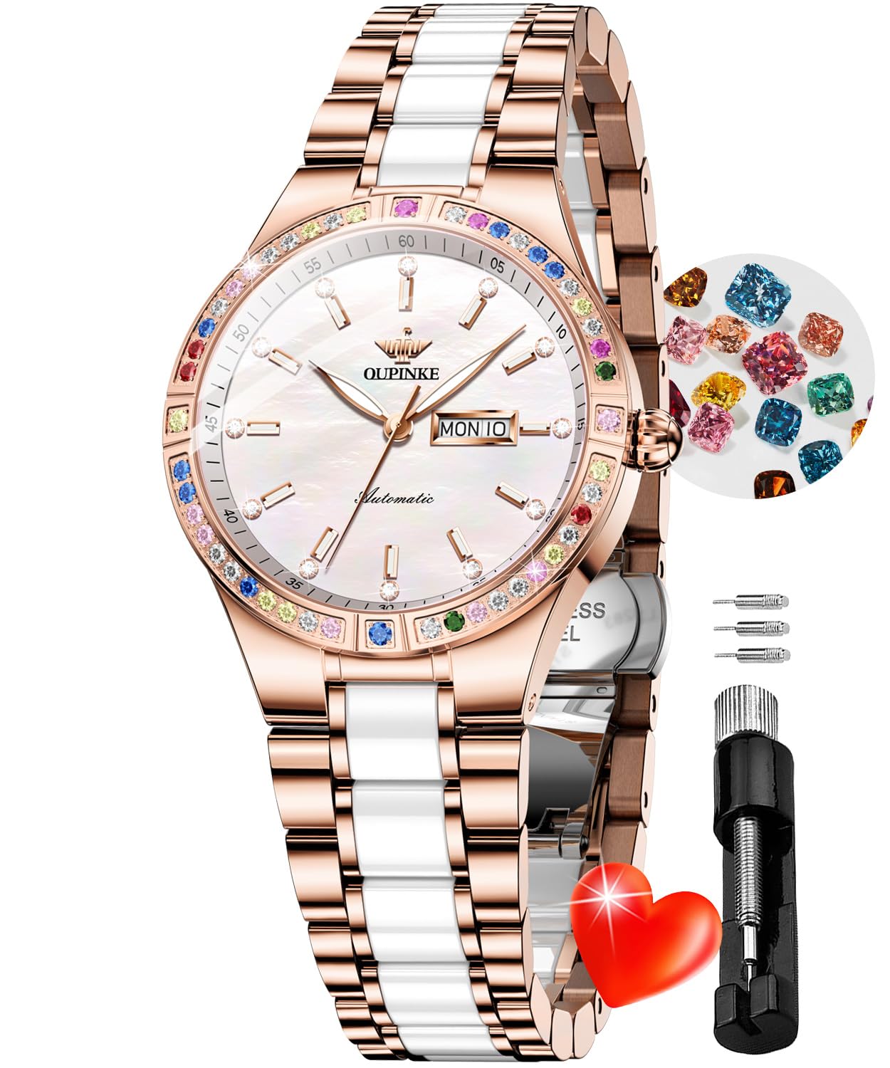 OUPINKE Women Automatic Watches Colorful Diamond Ladies Elegant Luxury Dress Mechanical Sapphire Crystal Rose Gold Ceramic Wristwatch